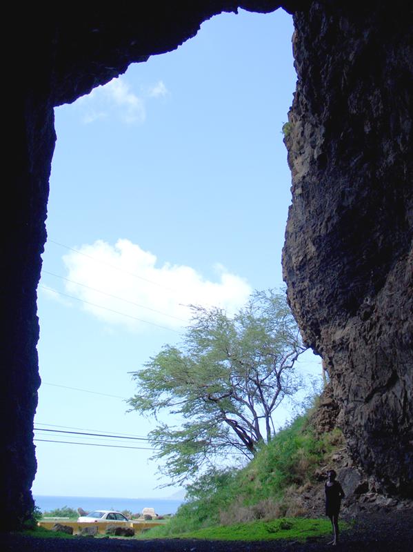 It must be rough working at the Kaena Point Satellite Tracking Station. The scenery would be very distracting! | On the drive back, we spotted Kaneana Cave. That's Ann in the lower right, and our car in the background. |