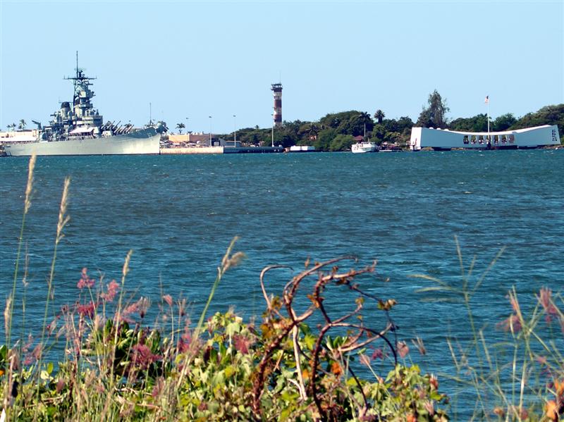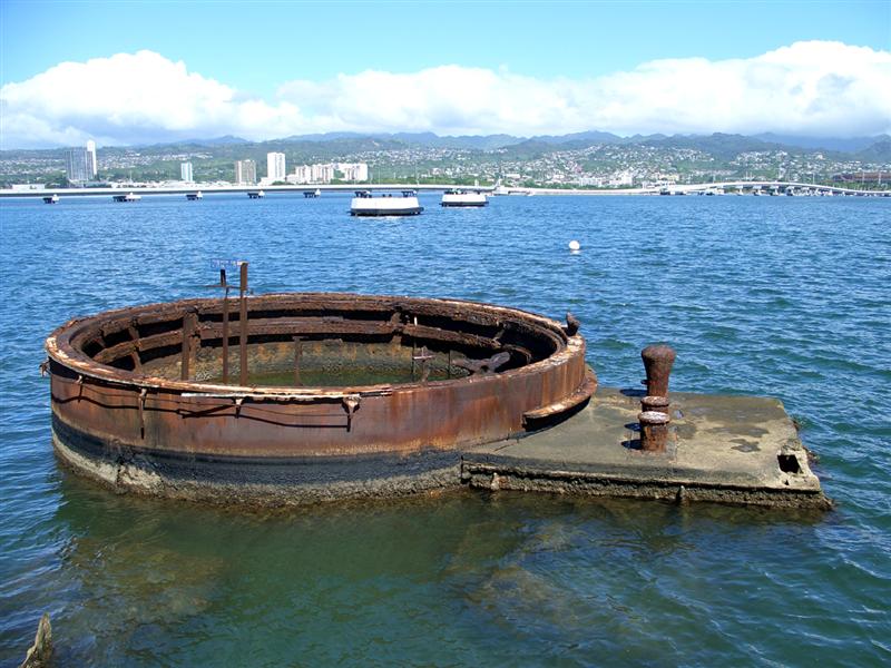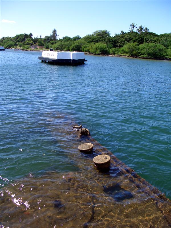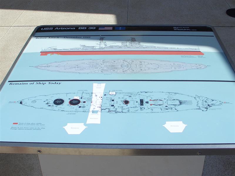 On another day, we drove to Pearl Harbor. That's the USS Missouri Battleship on the left, and the USS Arizona Memorial on the right. | Onboard the Arizona Memorial, this sign shows the layout of the sunken ship. |