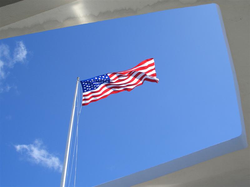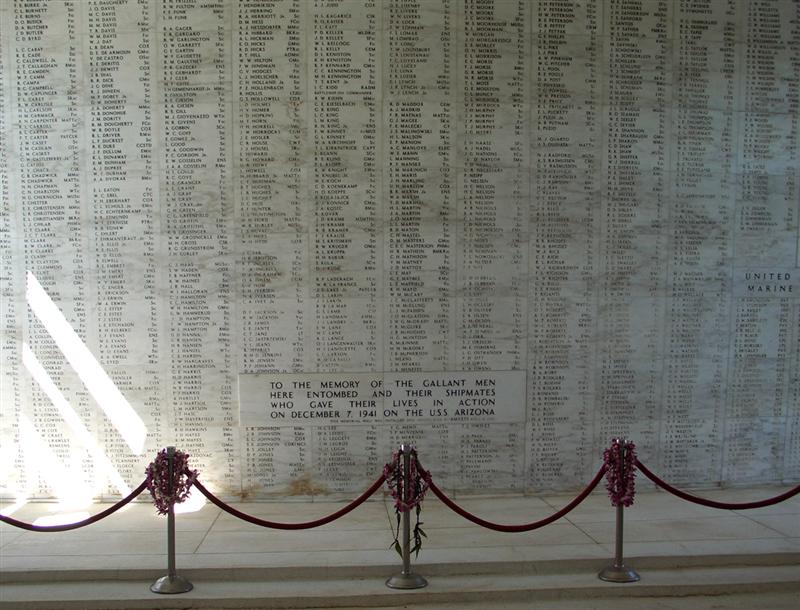 One end of the Memorial contains a roster of the 1177 crew members who died, many of whom are still interned in the ship. | The Flag will always fly over the Memorial. |