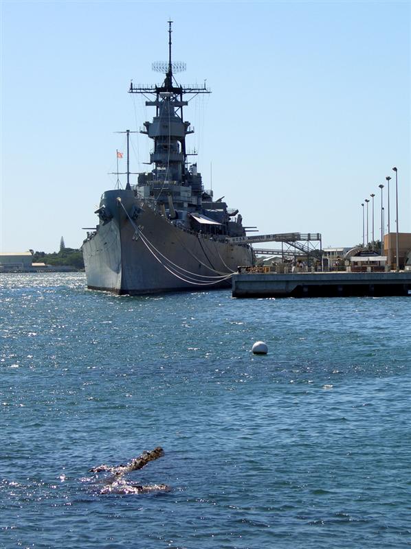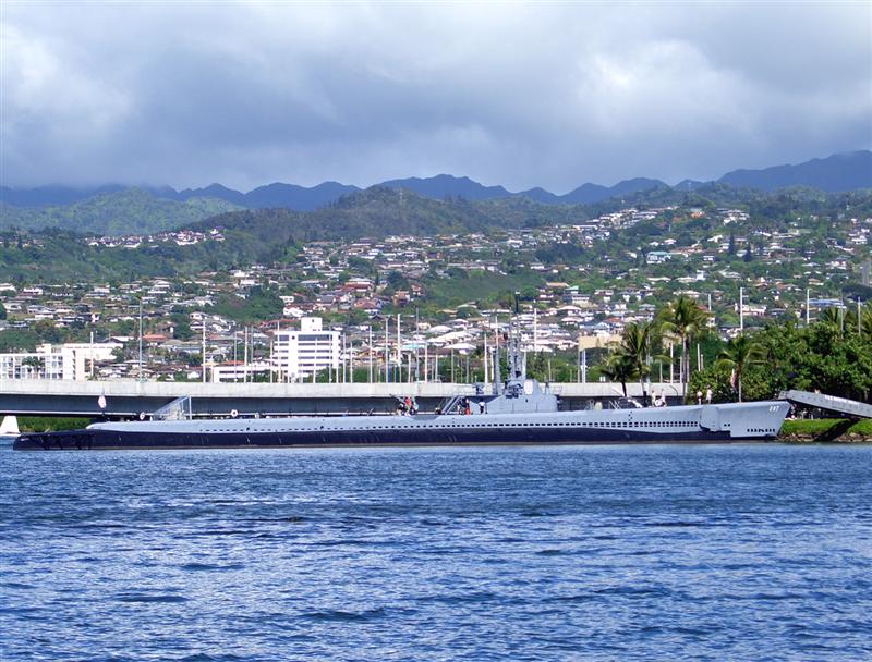 This is the Battleship USS Missouri Memorial, as seen from the USS Arizona Memorial. | On the boat ride back from the USS Arizona Memorial, we saw the USS Bowfin submarine. |