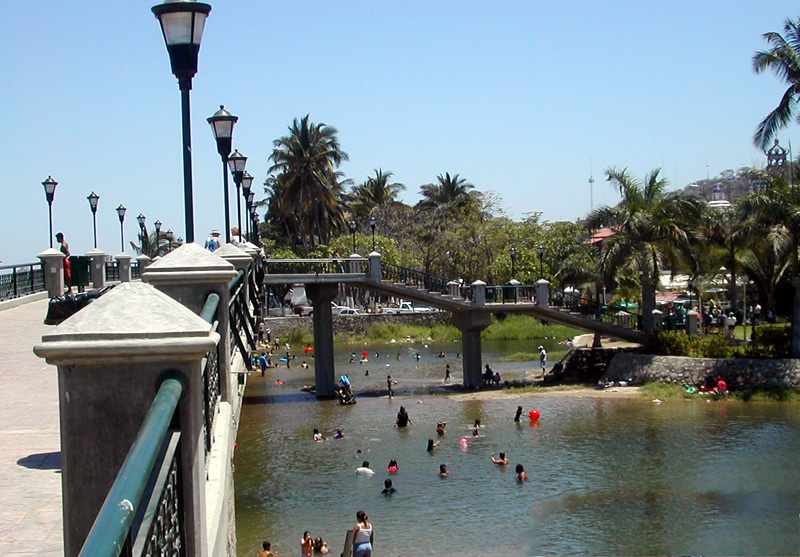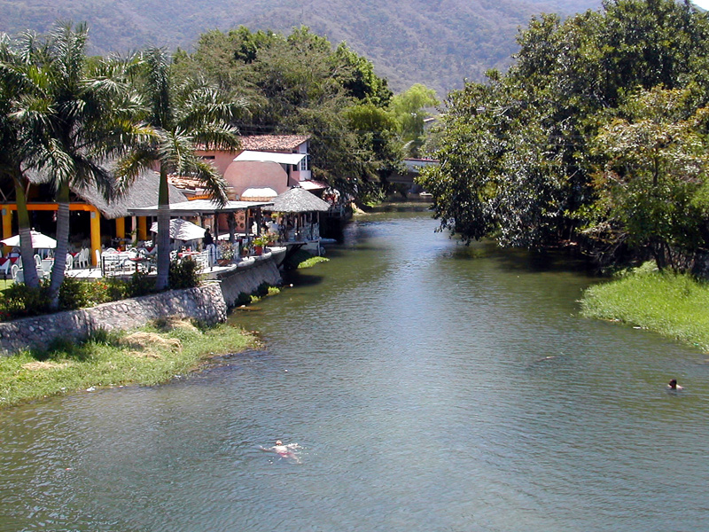 The Rio Cuale runs east/west through El Centro (the old center of town). The river flows around the narrow Isla Rio Cuale ("Cuale River Island"). This view from the bridge shows the south fork of the river, with the mainland on the right side, and the island on the left side.