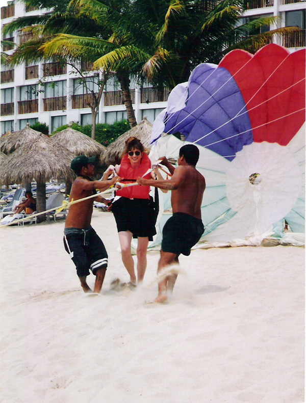 After watching enough successful take-offs & landings (and after drinking enough beers), a parasail ride starts to look like a good idea. Here is Ann at the moment of take-off.