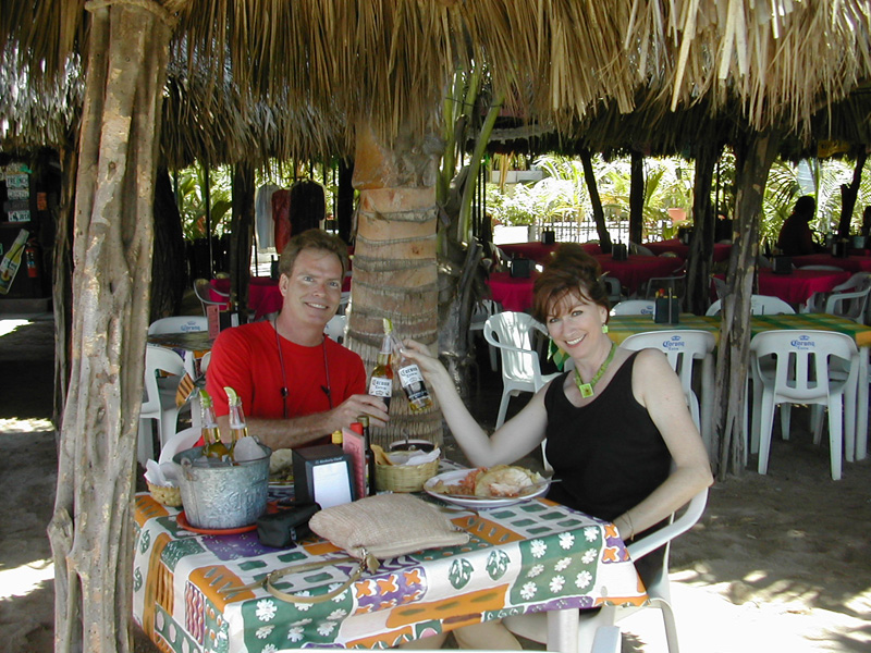 After all that walking, it's time to stop at one of the many beachside restaurants for a bite to eat and some cervesas. Here we are at Burro's Bar. The restaurant is right on the sand, and the "Buckets of Corona" are cheap and cold.