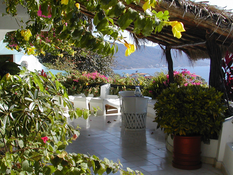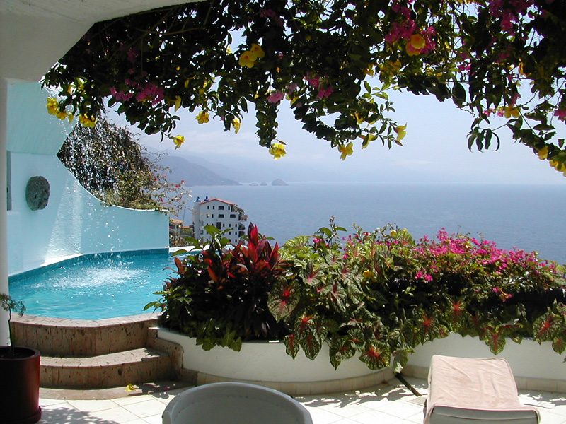 While sitting in the dining area, the view includes the pool, plenty of beautiful flowers, and the rocks of Los Arcos off in the distance.