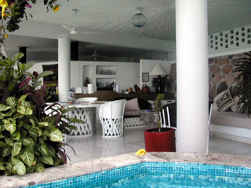 Now that you've seen some of the beautiful views from the villa, let's take a look inside the villa (although nothing is very "inside" here, due to the open-air architecture). Looking inward from the pool, this view shows the main dining area, with the kitchen at the back.