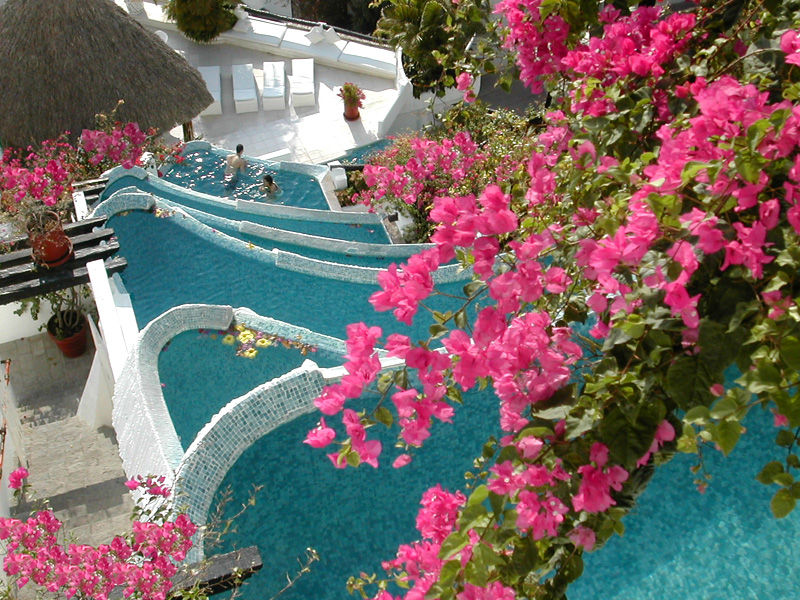 When the food & drink runs out in the Penthouse, the party often flows downhill to another villa. Villa 3 is often a favorite, because it has the largest patio of Villas 1 thru 9. Here's a view from Villa 3, looking up at the pools above.