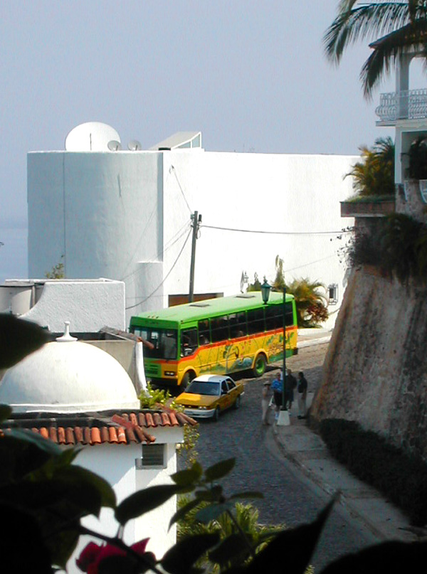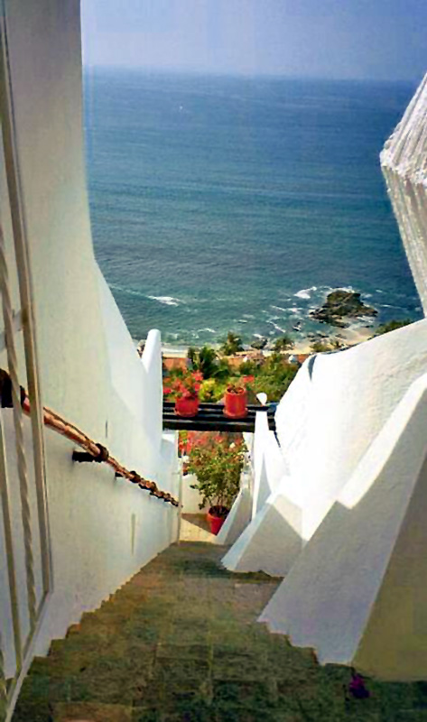 OK, let's force ourselves to leave our beautiful resort, so we can see the charming village of Puerto Vallarta. These are the stairs heading down from Villa Six. They make a jog to the left at Villa Four, so you can't see all the way to the bottom. Fortunately, there are entrances at the top & bottom of the resort. Since our villa is roughly halfway up the stairs, we have taxis pick us up at the bottom entrance, and drop us off at the top entrance.