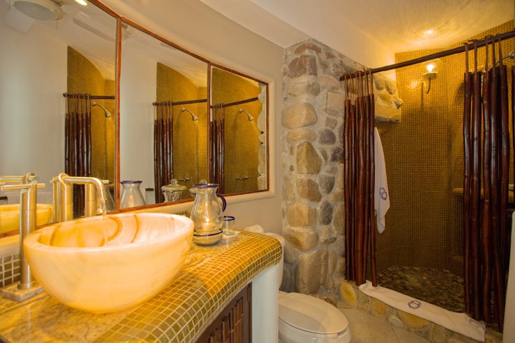 | The openings above the bedroom walls have been glassed-in to allow for air-conditioning. | The bathrooms have been re-tiled, with new sinks, fixtures, mirrors and lighting. But they still have that giant open-air shower. |