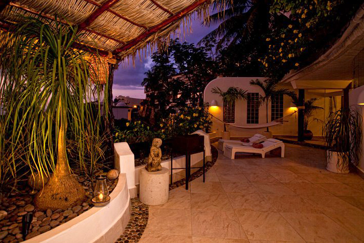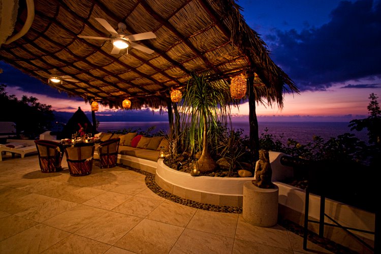 | The thatched palapa roof now has two lighted ceiling fans, as well as new hanging lamps and landscape lighting for the plant beds. | Here you can see the new wall sconce accent lighting. |