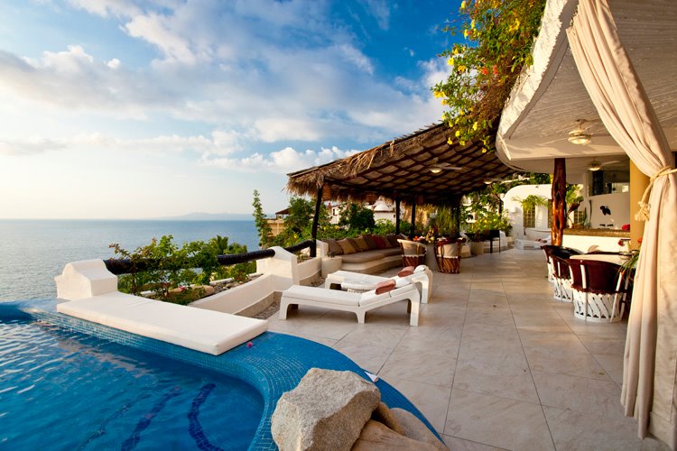 | This is the view as you enter the villa. Notice the new pool tiles, with darker tiles marking the edges of the steps. Also notice the wider ledge with a lounging cushion. | Here you can see the new non-slip stone tile flooring, and the new curtain that can be drawn across the living area to provide shade from the late afternoon sun. |