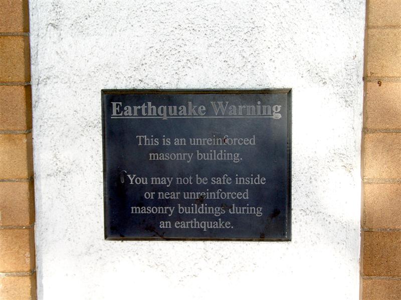 While eating at San Luis Obispo Downtown Brewing Company, we were amused by their dress code sign. | Another interesting sign was this earthquake warning, posted at the entrance to almost every building downtown. |
