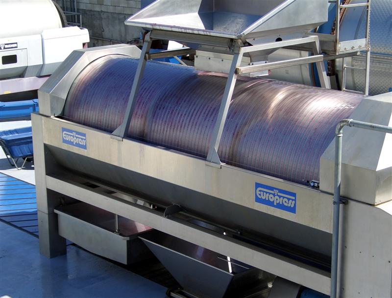 Big trucks rolled in loaded with grapes, and dumped the clusters into the destemmer/crusher. | After destemming & crushing, the resulting grape "must" is moved into the bladder press. |