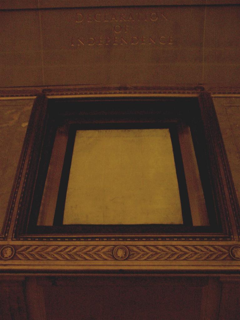 We were amused by this sculpture of a giant Typewriter Eraser at the National Gallery of Art's Sculpture Garden. | At the National Archives we saw the original Declaration of Independence, which is so faded that few words can be still be read. |
